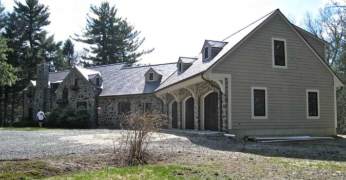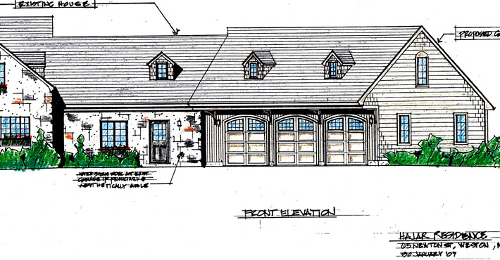 This shows the plan, to add a new 3-car garage at right with a huge bonus room on top.